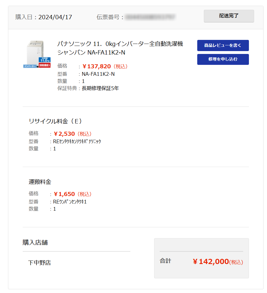 およそ1時間後に修理が完了した。モーターの力が弱い場合にそのような症状が出ることがあるのでモーターを新品に変えてくれたそうだ。西岡さんが試運転したら症状が出なかったとのことだった。延長保証の期間内なので修理代はエディオンが負担してくれるため、その日の私の支払は無しだ。ありがとう西岡さん、ありがとうエディオン。