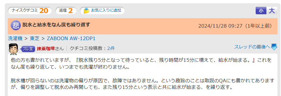 とのことであった。なるほど脱水を諦めて給水を何回もしたら時間がかかるだろう。原因は何なのかインターネットを検索してみた。どうやら洗濯機が洗濯物の偏りを直そうとして、そのような挙動になるらしい。