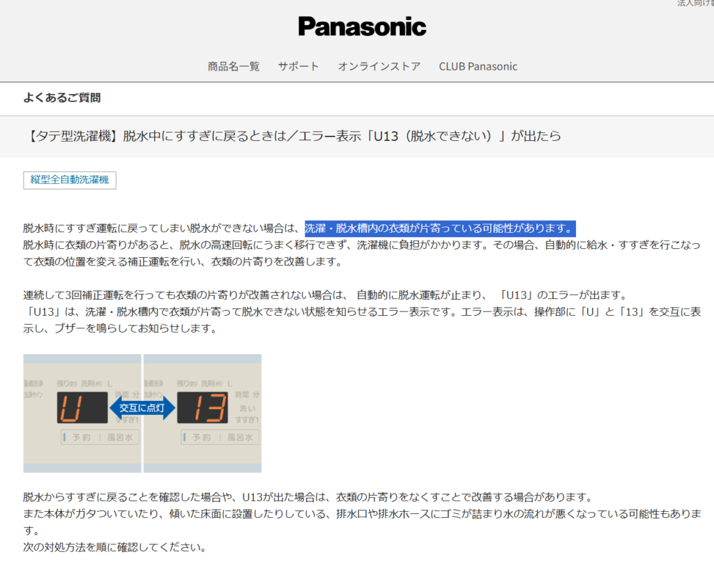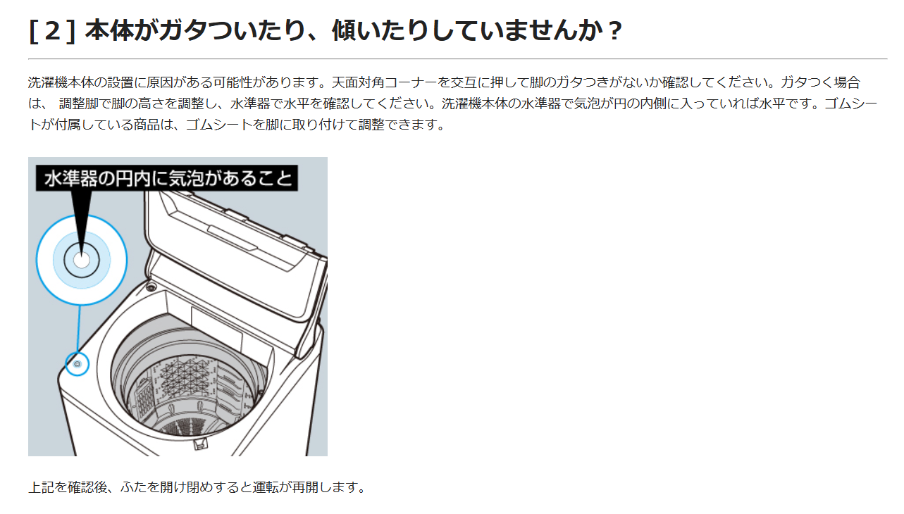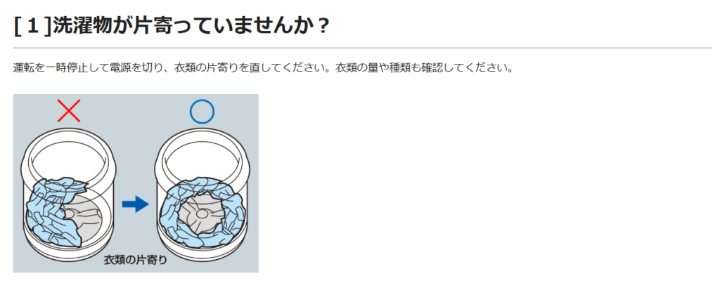 カカクコムの口コミによると「洗濯物の偏りが原因で故障ではありません」とある。Panasonicの公式サイトにも同じような情報があった。