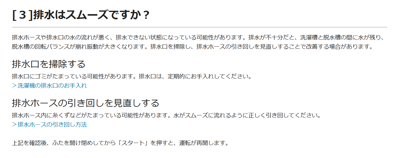 電源を入れ直したら高速回転に移行できるならそもそも洗濯物の偏りなど生じていないのではないか。どういうことなのか。まだ2年経っていない洗濯機を買い替えるという選択肢も無い。そもそも買い替えてまた同じ状況に陥らないという保証もない。改善しないときはどうすればいいのか。Panasonicのサイトを読み直す。