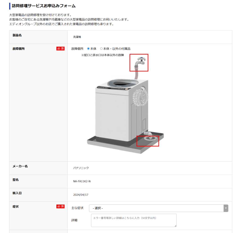 生活家電をクリックして進んでいくと縦型全自動洗濯機のお問い合わせ入力画面にたどり着いた。