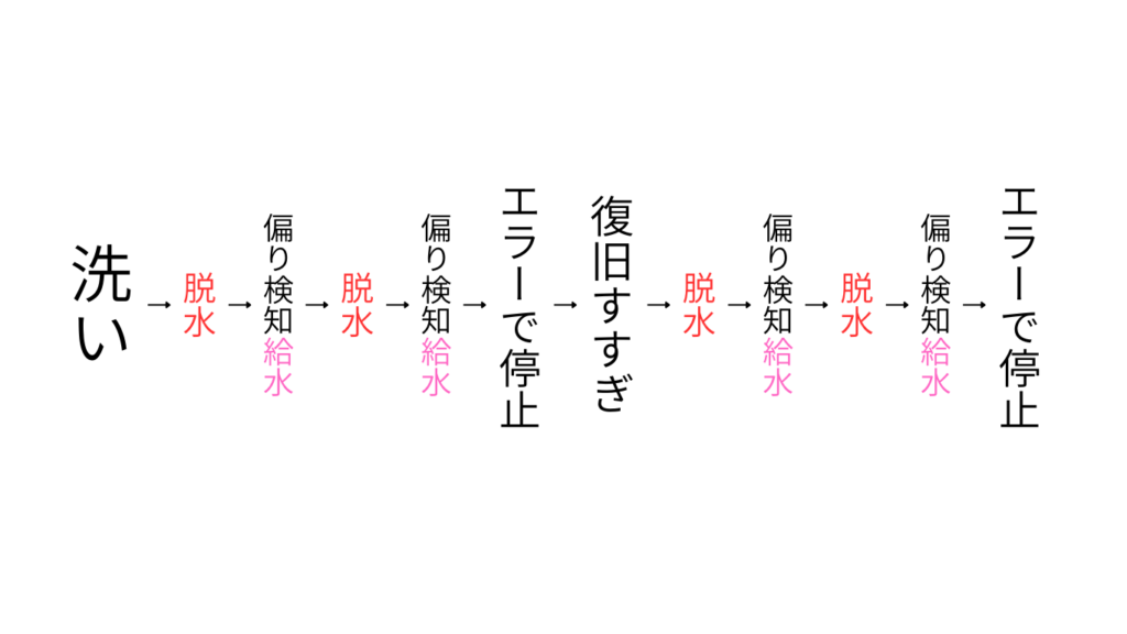 我が家の洗濯機はこの2回の脱水で、どちらも偏り検知して給水に戻る。図にするとこう↓だ。