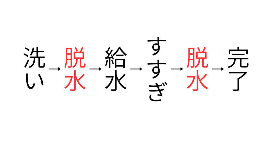 細かく見ると洗いのあとに一度脱水が入る。洗濯物が吸収した洗濯液をすすぐためにまず脱水するのだ。その後真水を給水して、真水で洗う。これがすすぎだ。その後脱水を行う。一度の洗濯で脱水が最低2回発生する。つまり以下のような工程になる。