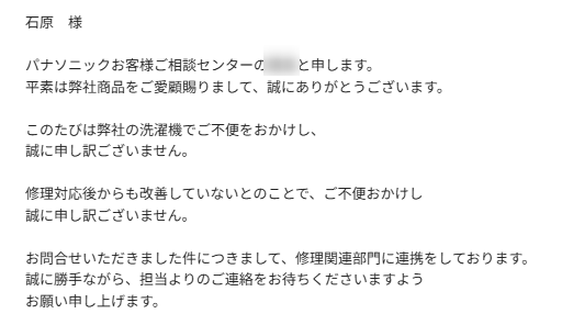 Panasonicの本社の人「石原さん、大変ご迷惑をおかけしました、そして貴重な情報をお寄せいただきありがとうございます。我々このような症状は初めて確認しました。今後の商品開発に活かすためにもぜひ石原さんのご使用中の洗濯機を我々に預からせてください。研究所に持ち込んで詳細を調べてみたいんです。もちろん代替機をお持ちしました。Panasonicの最新機種です。あとこれは迷惑料の金一封です。ご迷惑をおかけしたのでご笑納ください」