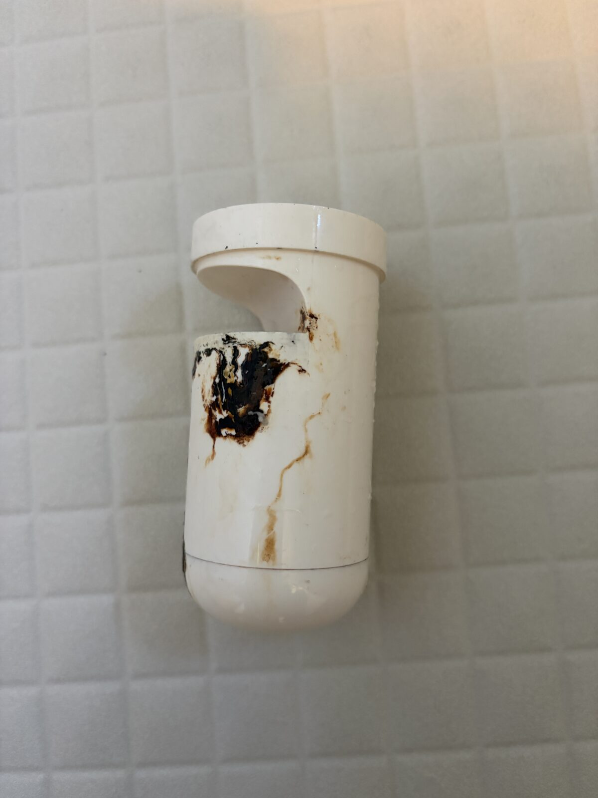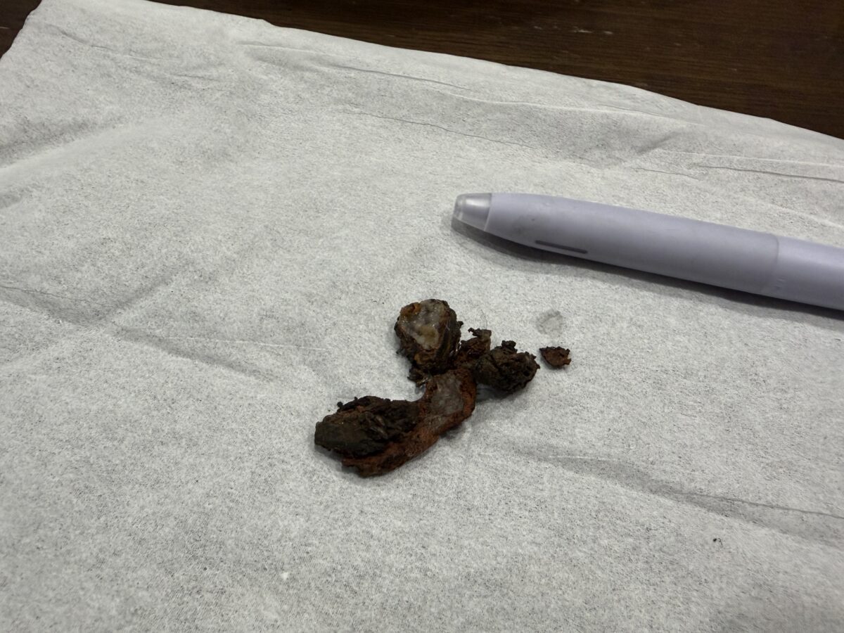 トラップの内部を掃除しようとしてさらに驚いた。なかから茶色い塊が転がり出てきたのだ。鉄臭い匂いのする綿の塊のようなものだ。握るとボロボロと崩れる。石鹸カスと排水中の鉄分が固まったものと想像した。